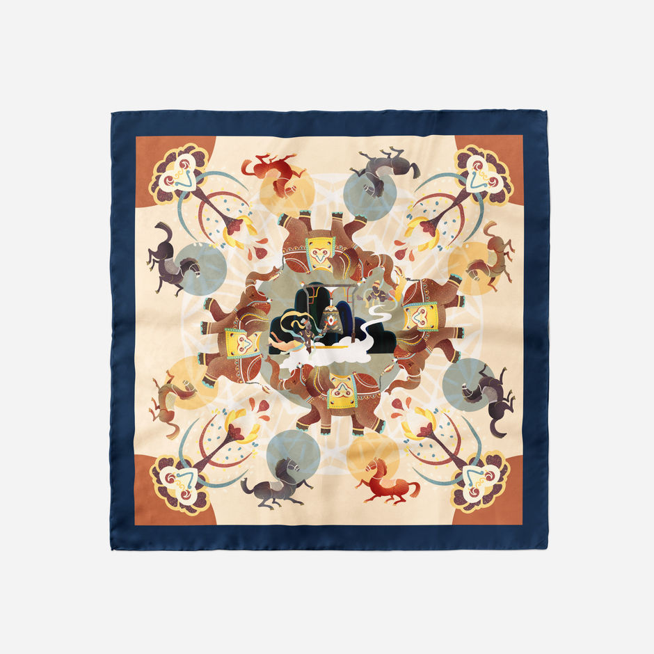 Different products made by extracting single element of illustration (generally available in cultural and creative products, museums, and souvenir shops), including tea set packaging, silk scarves, mobile phone cases, beauty product packaging, entertainment products and car stickers.